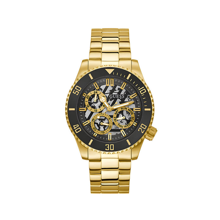 Brand Name GUESS Model number GW0488G2 Part Number GW0488G2 Item Shape Round Dial Window Material Type Mineral Glass Display Type Analog Clasp Type Buckle Case Material Stainless Steel Case Diameter 45 millimetres Case Thickness 10 millimetres Band Material Stainless Steel Band size Mens Standard Band Width 9 millimetres Band Colour Gold Tone Dial Colour Black Bezel Material Metal Bezel Function Unidirectional Calendar No Calendar Special Features Chronograph Weight 167 g Movement Quartz
