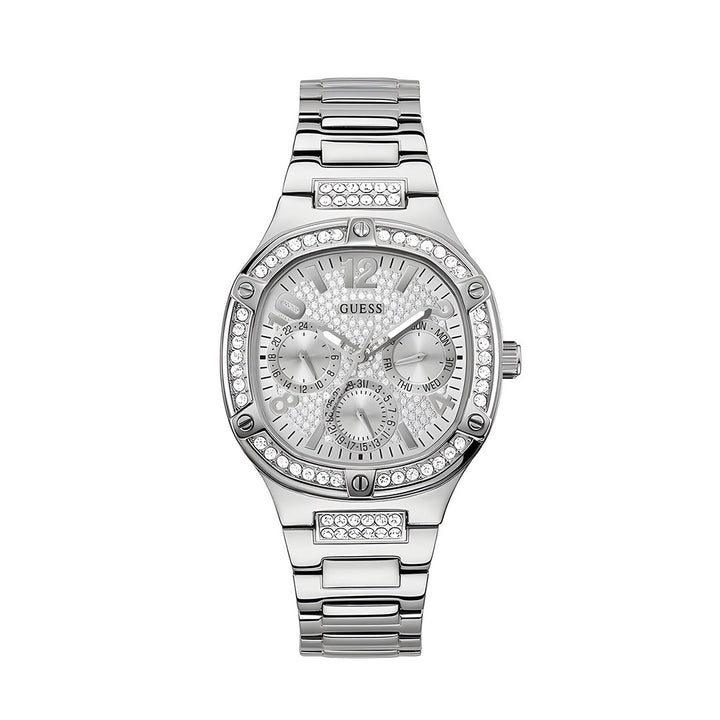 This is the Guess Duchess Silver Women's Watch GW0558L1. The definition of sport bling, this watch is made for the GUESS girl who wants a watch that can move effortlessly through all facets of her life. The 40mm polished stainless steel case with crystal and screw details on the bezel is complimented by a full powdered dial and a touch of stone on the stainless steel bracelet adds to the glam.