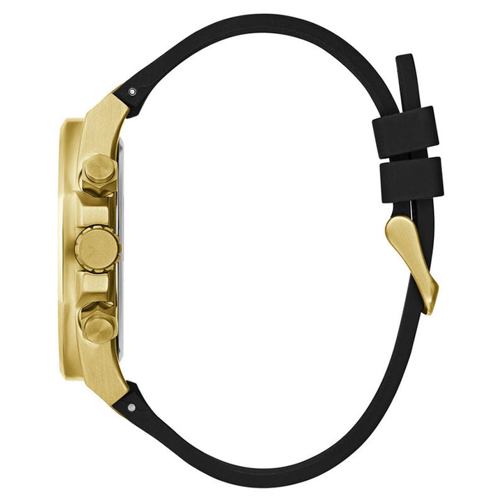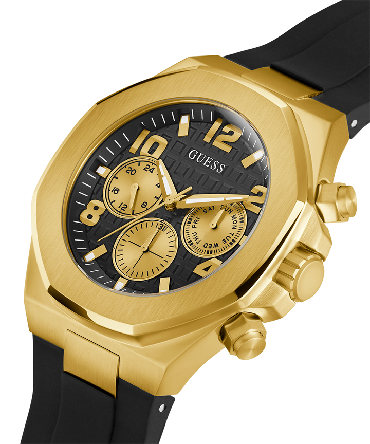 This is the Guess Empire Black Men's Watch GW0583G2. This GUESS watch is designed for those who live a full life. A striking 46mm gold tone case and octagonal bezel pair perfectly with a black and gold multifunction dial and a sporty black silicone strap complete the look. This timepiece is made to work hard alongside you.