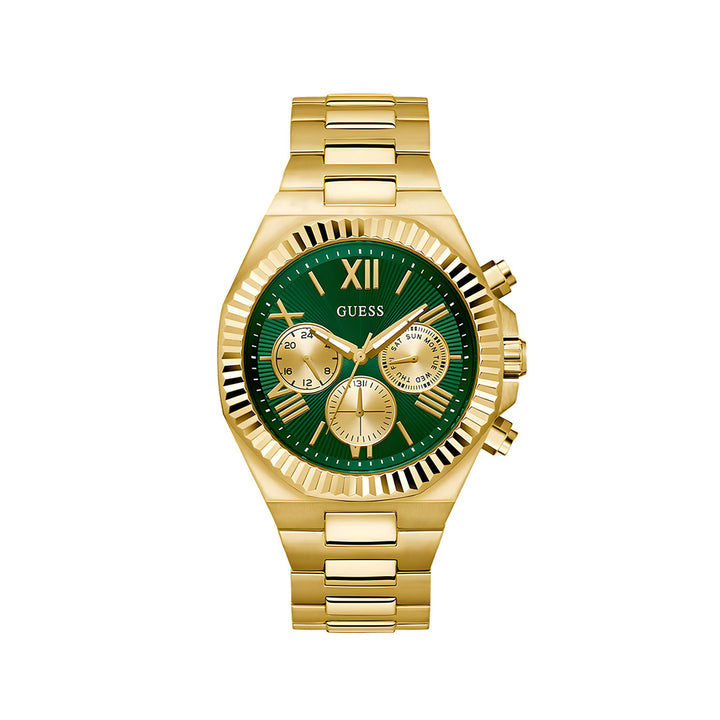 A statement timepiece fit for a boss. This sophisticated new style from GUESS Watches features a contemporary gold tone stainless steel bracelet, complimented by a striking 44mm coin edge bezel that pairs perfectly with a green sunray multifunctional dial to complete the look.