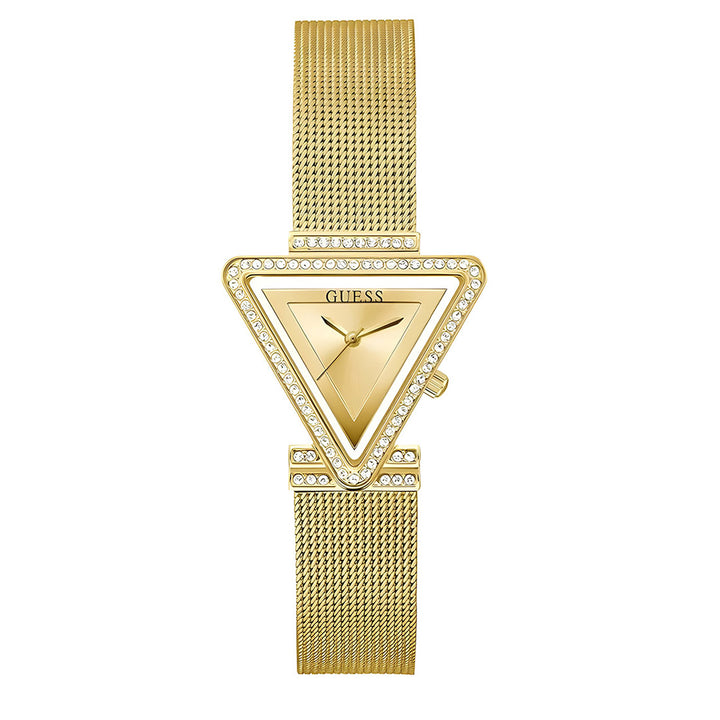 This alluring case design of the GUESS triangle logo has a fully glitz look with tonal dial and sleek self-adjustable mesh bracelet.