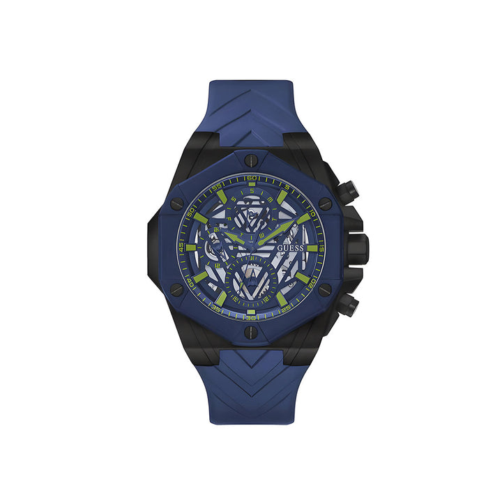 A unique men's watch from the Guess Formula collection with a sporty design. The model is made of stainless steel with a black coating and a dark blue coating on the bezel, reinforced with mineral crystal glass, in combination with a blue polymer strap. The display is multifunctional and skeleton type, which allows you to observe the quartz mechanism, with arrows and indications in lime color. The case size is 47 mm. Water resistance: 5 ATM - allows hand washing, heavy wetting is not recommended.