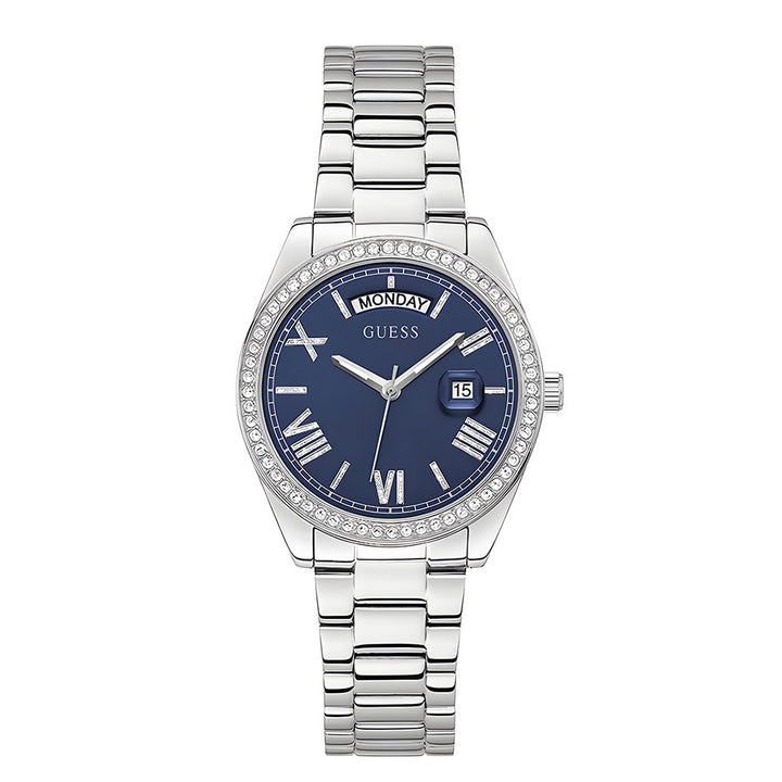 Guess Luna GW0307L1 is a beautiful and interesting Ladies watch. Material of the case is Stainless Steel and the Blue dial gives the watch that unique look. 30 metres water resistance will protect the watch and allows it to be worn in scenarios where it is likely to be splashed but not immersed in water. It can be worn while washing your hands and will be fine in rain. We ship it with an original box and a guarantee from the manufacturer.