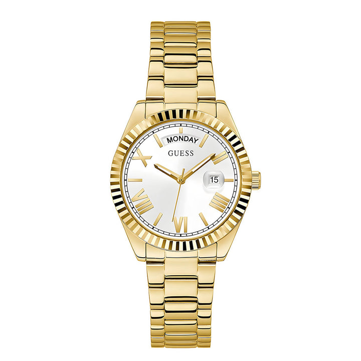 A classic look that never gets old. This coin edge bezel is integrated with a polished 3 link bracelet and features a day of the week window at the 12 o'clock hour with a bubble date at the 3 o'clock hour