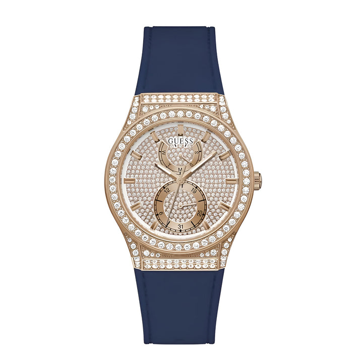 Elevate your style with the Guess Multifunction Crystals Rose Gold Dial Blue Rubber Strap Watch For Women - GW0439L4. This stunning watch features a multifunction dial with sparkling crystals, set on a vibrant blue rubber strap. Perfect for any occasion, this timepiece effortlessly combines fashion and function.