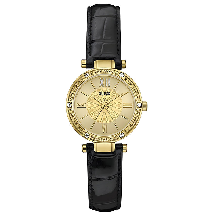 Guess Park Avenue Quartz Gold Dial Black Leather Strap Watch For Women - W0838L1