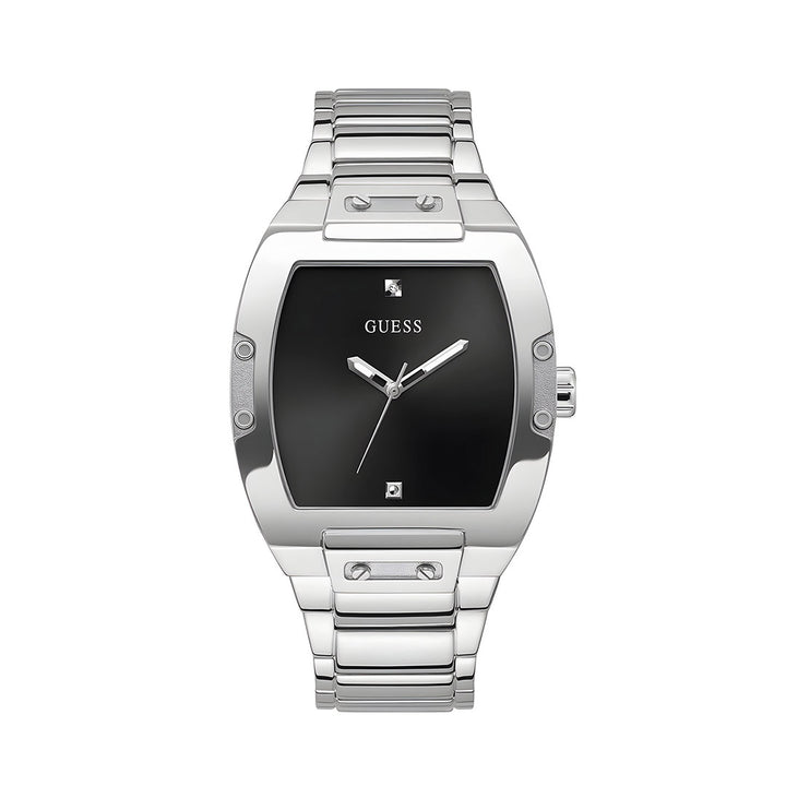 Men's only time watch from the phoenix collection by Guess. Only time clock with case made of stainless steel of steel color with glossy finish. Case size: 43 mm. The case is square in shape. The dial is black with a sunray finish. The strap is made of steel-colored stainless steel with a glossy finish. The closure is with pilot buckle. The movement is quartz with analog display. The resistance to water is 50 atm. Features: 3h. The reference is gw0387g1