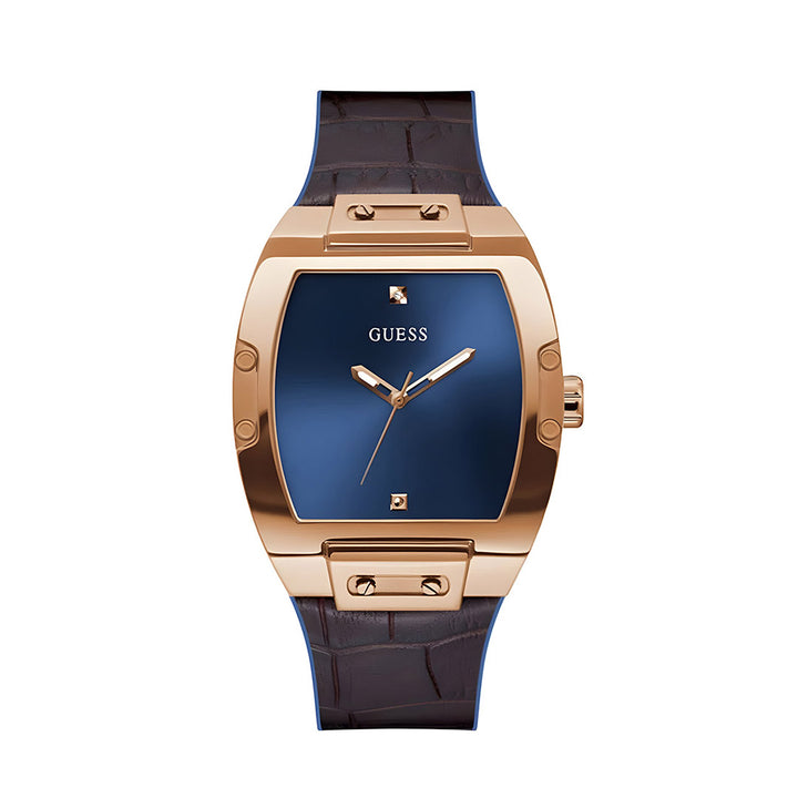 A genuine diamond dial keeps this phoenix on the rise. Featuring a rose gold-tone barrel shaped case with a blue dial, this also features a FLEX strap. Soft blue silicone is paired with a brown croco-look leather to create a Flexible fit for every wrist.