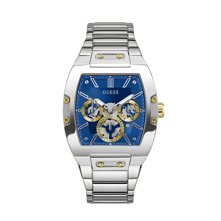 The Guess GW0456G5 Phoenix Multi-Function watch captivates with its bold design and intricate details. The silver-tone barrel-shaped case provides a sleek backdrop for the blue and gold multi-function dial, showcasing a blend of sophistication and functionality. Its skeleton dial details add a unique touch, revealing the inner workings of timekeeping.