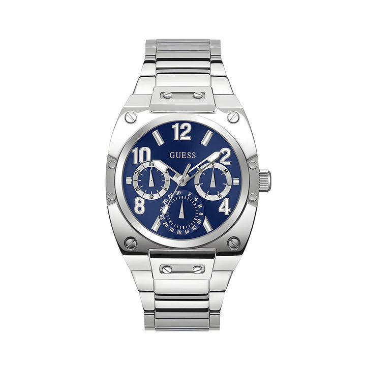 A true prodigy, this style has it all! Featuring a rectangular case with screw detailing and a round dial design with multifunction movement and an elegant bracelet connection. Elevate your look this season with our Silver Blue Prodigy Watch. Designed from a stainless steel material, this watch features a silver-tone case bezel and band, rectangle case, blue sunray dial, pilot buckle closure, multi-function movement, and GUESS logo detailing.