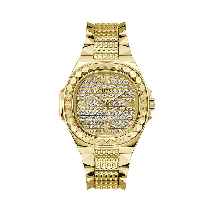 Guess Rebel GW0622G1 is a watch whose envelope and bracelet are made of gold-colored stainless steel. The dial of the same color is decorated with crystals and is protected from damage by mineral glass. The model bases its operation on a quartz mechanism.