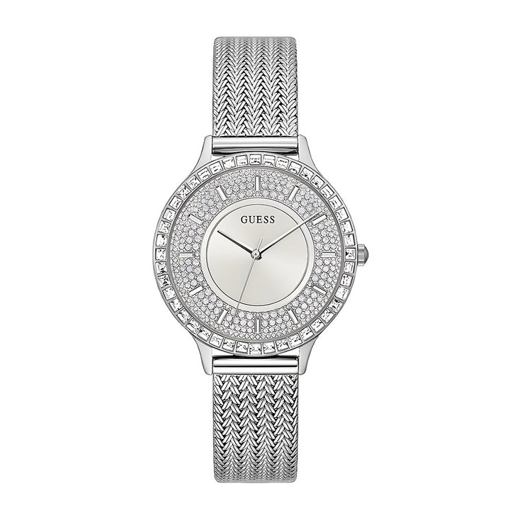 This Guess GW0402L1 Soiree Silver Tone Mesh Watch is a beautiful timepiece, set with an array of glistening crystals. The stunning look is accentuated by a unique, finely crafted bracelet with a comfortable feel on your wrist. A sunray texture gives the dial a gentle shine to match the shimmering stones.