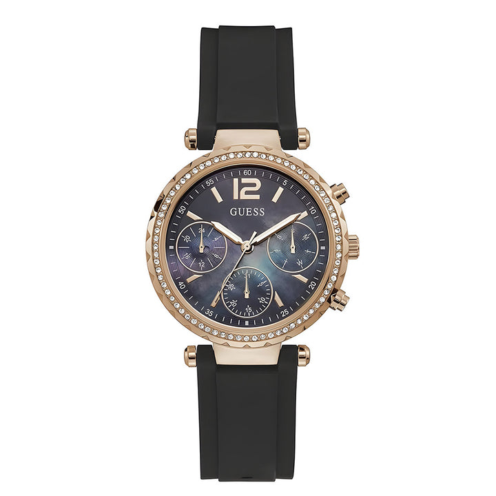 Guess Solstice Diamonds Black Mother of Pearl Dial Black Rubber Strap Watch for Women - GW0113L2
