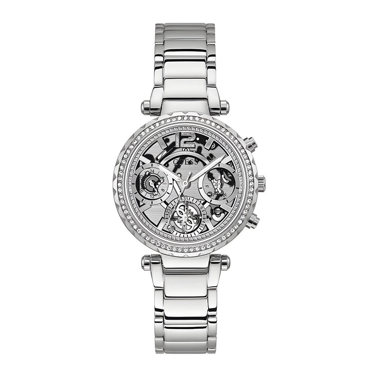 Sweet and sophisticated, this silhouette features a see-thru dial with quattro G pattern design at the 6 o clock hour and a fully crystal bezel with a t bar connection to its chic polished bracelet