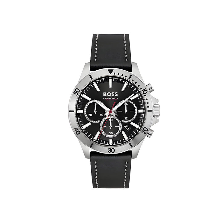 Hugo Boss 1514055 Troper men's watch made of stainless steel with analog quartz movement. It has a 45 mm diameter case with a black dial, calendar between 4 and 5 o'clock, and white luminescent hands and indexes. The watch is presented on a black leather strap with a buckle closure.