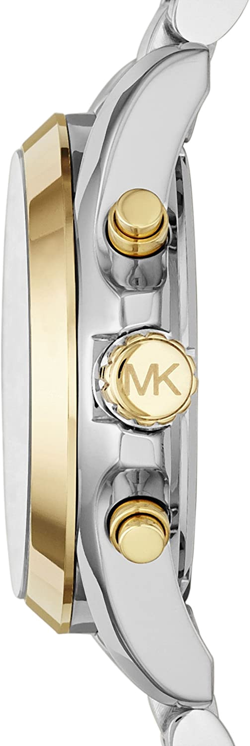 Michael Kors Bradshaw Chronograph Dial Two-tone Ladies Watch MK5855 features a 43mm wide and 13mm thick two tone yellow gold plated solid stainless steel case with a fixed bezel and textured push-pull crown with function pushers. Michael Kors MK5855 is powered by quartz chronograph movement.