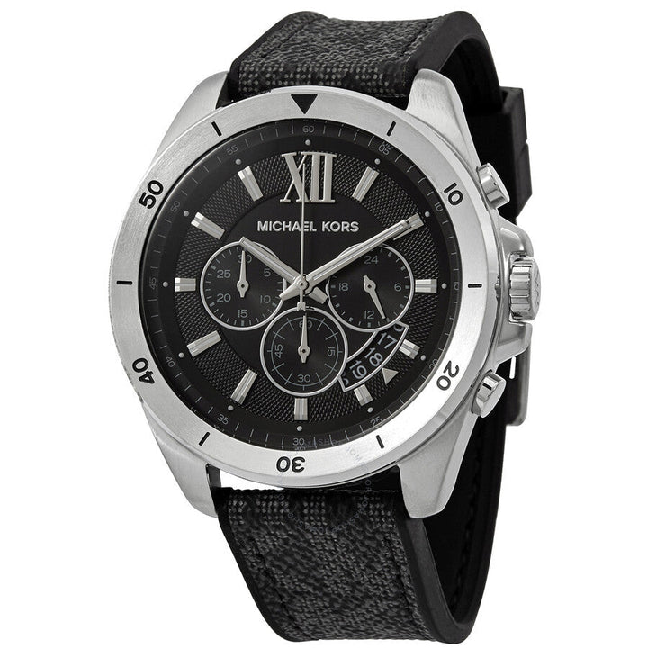 Michael Kors' Brecken 45mm watch features a black dial with silver-tone stick indexes, silver-tone concave tachymeter topring, chronograph movement and black logo-print PVC strap.