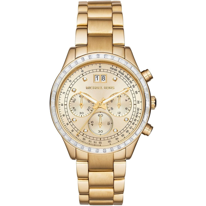 Gold-tone stainless steel case and bracelet. Fixed gold-tone bezel set with baguette crystals. Gold dial with gold-tone hands and crystal hour markers. Minute markers. Tachymeter around the outer rim. Dial Type: Analog. Luminescent hands and markers. Date display below the 12 o'clock position. Chronograph - three sub-dials displaying: 60 seconds, 60 minutes, and 24 hours.