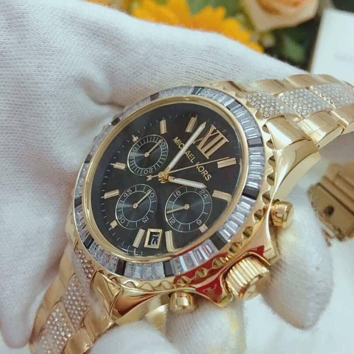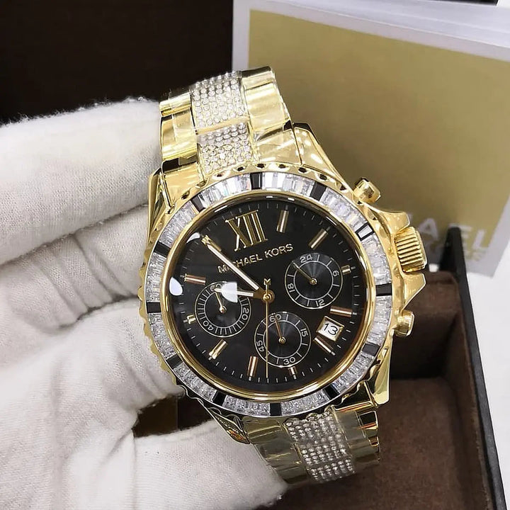 Michael Kors Everest Chronograph Black Dial Gold Steel Strap Watch For Women - MK5828