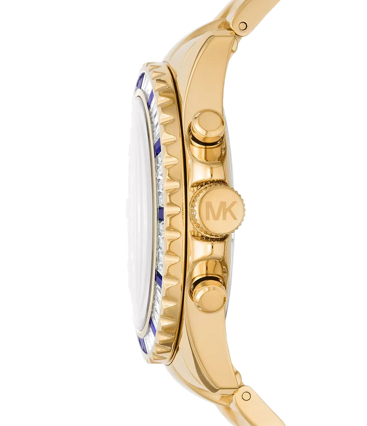 Michael Kors' 42mm Everest watch features a blue sunray dial, gold-tone case with blue and clear baguette topring, chronograph movement and gold-tone stainless steel bracelet.