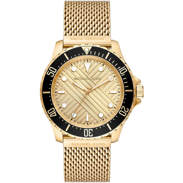 Our Men's Everest platform is updated for the season with a 43mm case size, and mesh bracelet. Featuring a new textured dial with a three-hand movement, this gold-tone stainless steel Everest maintains its iconic design details with a notched sport topring.