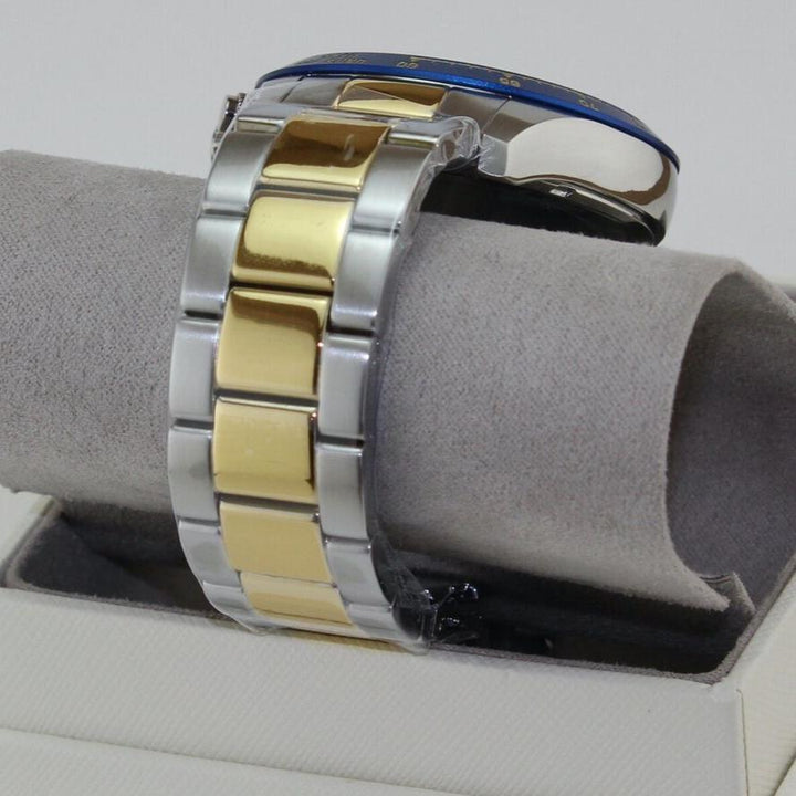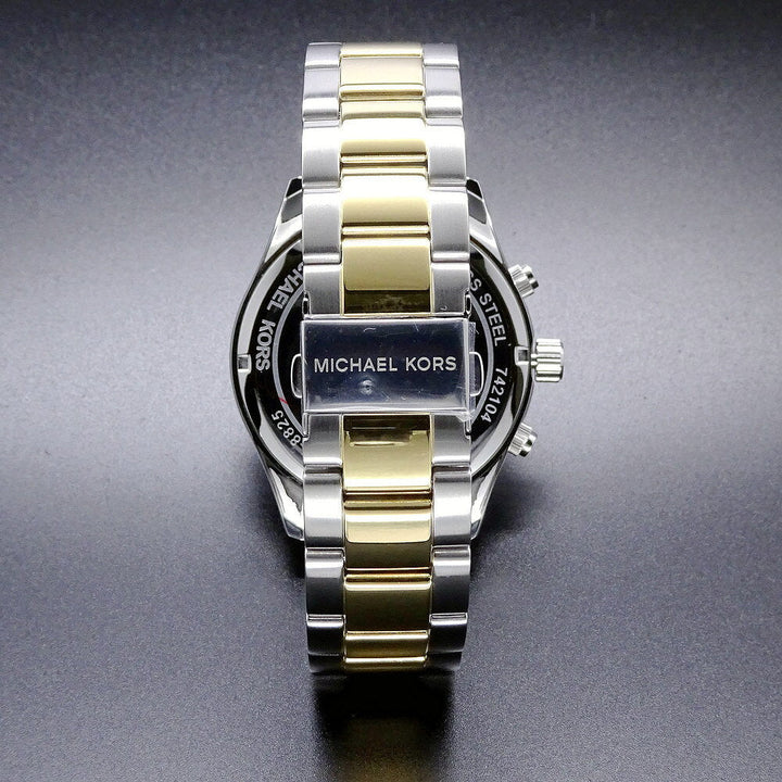 Blue dial enhanced by luminous gold-tone hands. Silver-tone stainless steel case with a two-tone (silver-tone and gold-tone) stainless steel band. Quartz movement. 50 meters / 165 feet water resistance. Fixed bezel. Scratch Resistant Mineral crystal. Solid caseback. Fold Over with Safety Release clasp. Pull / Push crown. Case size 45 mm x 10 mm. Band 22 mm x long. Michael Kors MK8825 Layton Watch.