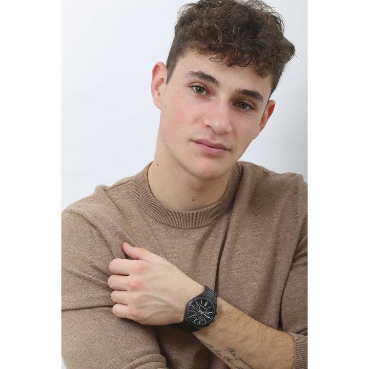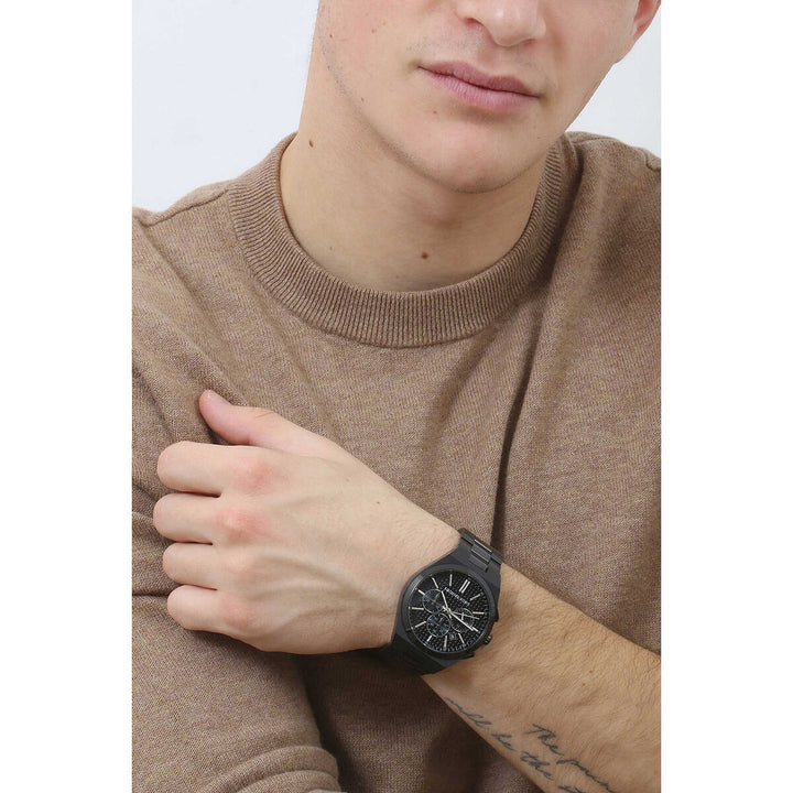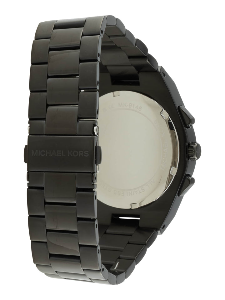 Michael Kors' 40mm Lennox watch features a black textured dial, chronograph movement and black stainless steel bracelet.