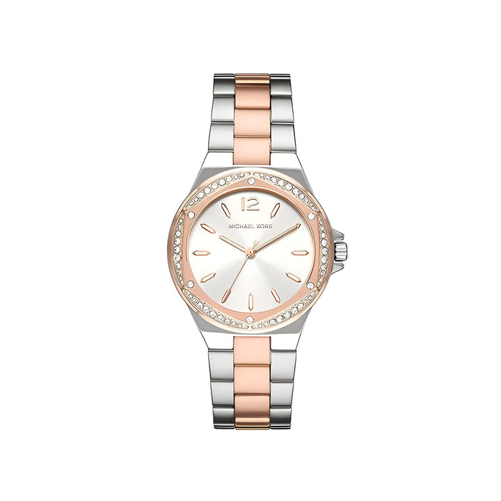 Michael Kors' 37mm Lennox watch features a white sunray dial with white indexes, silver-tone case with a faceted rose gold-tone pavé topring, three-hand movement and stainless steel bracelet with rose gold-tone center links.