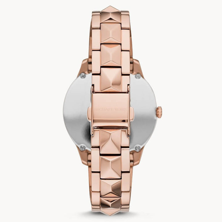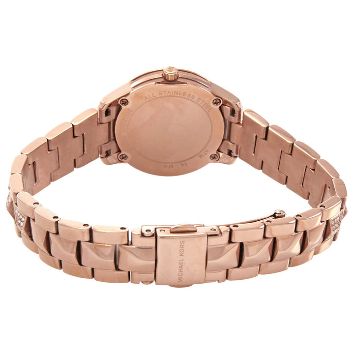 Rose gold-tone stainless steel case with a rose gold-tone stainless steel bracelet set with crystals. Fixed rose gold-tone bezel. Mother of pearl dial with rose gold-tone hands and index hour markers. Dial Type: Analog. Quartz movement.