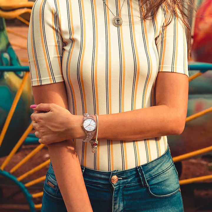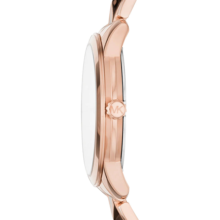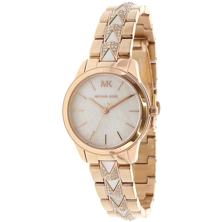 This 28mm Runway watch features a white mother-of-pearl dial with rose gold-tone stick indexes, three-hand movement and rose gold-tone stainless steel bracelet with mother-of-pearl and glitz center-links.