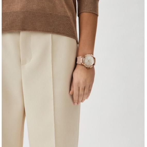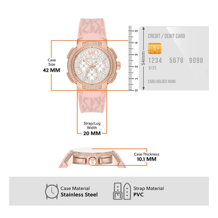 This signature logo pvc print gets an update in ballet pink inlaid on a blush silicone strap on this 42mm Sidney. The logo doesn't stop there, as it extends onto the dial with a stunning novelty print. paired back to a rose gold-tone case with a pave topring, this bold watch is the epitome of sport-luxe style.