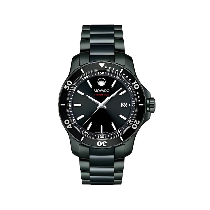 Scratch resistant sapphire crystal. Screw down crown. Solid case back. Round case shape. Case size: 40 mm. Case thickness: 10 mm. Bracelet width: 20 mm. Fold over clasp with a push button release. Water resistant at 200 meters / 660 feet. Functions: date, hour, minute, second. Dress watch style. Movado Series 800 Black Dial Black PVD Men's Watch 2600143.