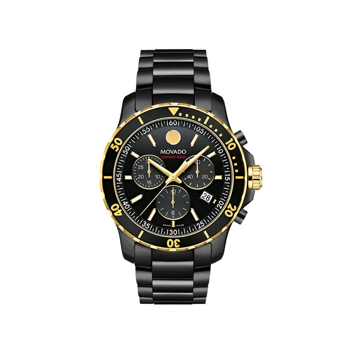 Experience elevated sporty style with a modern twist. In sleek black and shining gold, this chronograph makes a bold and stylish statement. The 42mm case showcases a sleek black dial with three sundials, Swiss Super detailing on the hands and hour markers, a date window, and our iconic dot at 12 o’clock. Inspired by divers' watches, the unidirectional rotating bezel, screw-down crown, Series 800 cashback, and fluid bracelet complete this must-have design. Powered by quartz movement with water resistance up to 200 meters and a scratch-resistant sapphire crystal. Secured with a deployment clasp featuring a push button closure.
