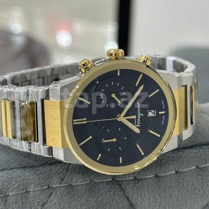 Elevate your sporty style with the Salvatore Ferragamo SFME00921 Chronograph. This Swiss-made watch features a two-tone stainless steel bracelet, seamlessly blending silver and gold tones. The 41mm round case, crafted in silver, complements the black dial with stick indexes.