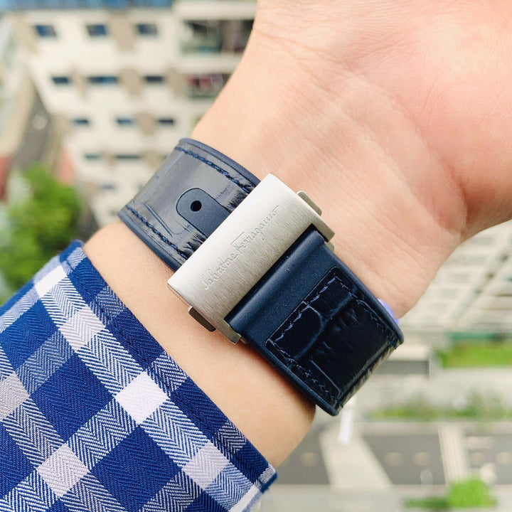 The new F-80 Classic collection comes with a slimmer and smaller case. Its sport-luxury spirit has made it a bestselling Salvatore Ferragamo Timepieces line. Functional on a quartz movement and protected by a sapphire glass, the blue round dial is housed in a stainless steel case. Besides, it is completed with a deployment buckle clasp to ensure a secure fit on the wrist.