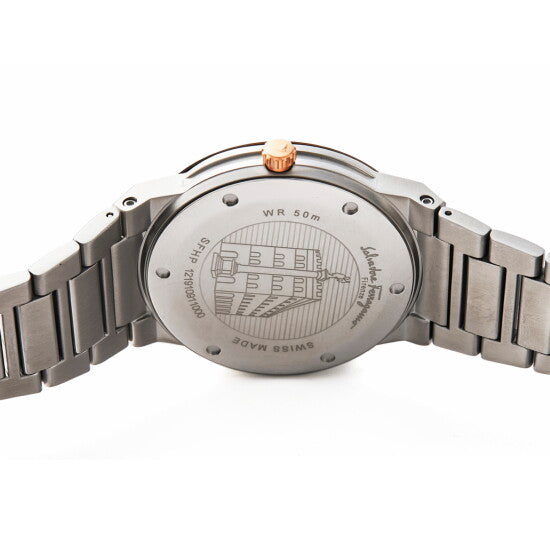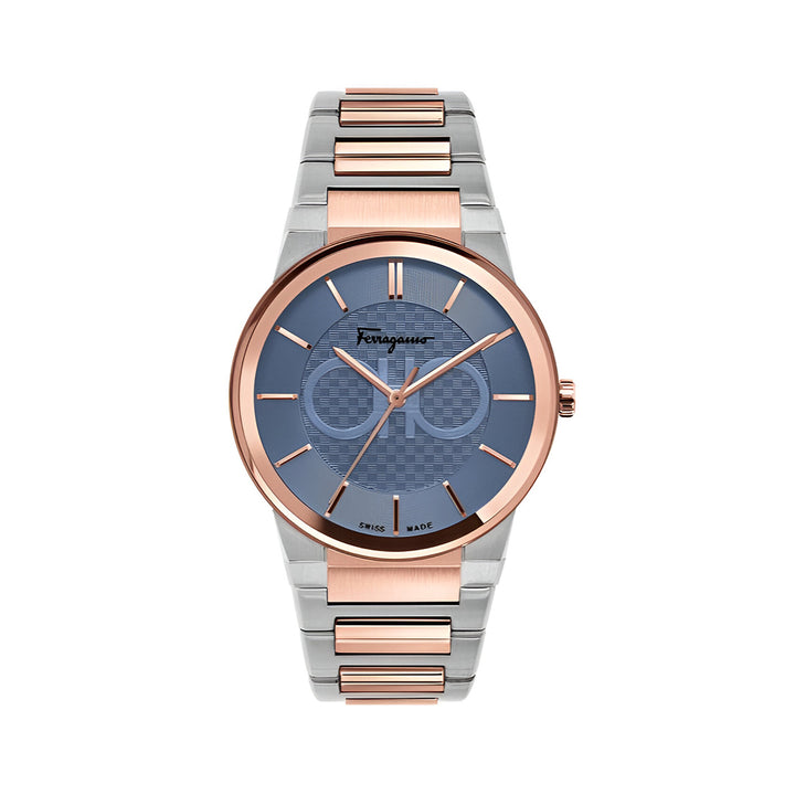 Ferragamo's new modern watch collection carries an innovative feature: the sapphire glass covers the whole dial and the top ring creating a stunning unique layer. The Ferragamo brand is underlined by the Double Gancini logo on the dial while the bracelet lends a sporty-yet-classy look.Ferragamo Sapphire watch stands out for its new aesthetics, contemporary, trendy, innovative design. It features a sapphire glass that covers the whole dial and the top ring alike, creating the extraordinary effect of a unique layer. The jeans checked patterned 41 mm dial with Double Gancini logo and bicolor bracelet, butterfly buckle with Double Gancini logo completes the look. The Swiss Made watch comes with three hands and quartz movement.