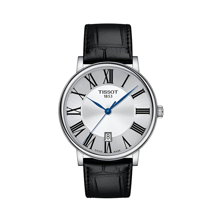 The Tissot Carson, an all-timer which will suit any time or place, will be the perfect partner to accompany you to every great occasion in your life so that every moment you live is right on time. Its classic style allows it to never go out of date, while giving it its sumptuous look, highlighted by a graceful dial design and elongated fine hands that move around the dial in time. This version features a stainless steel case with a black leather strap, silver dial with blue hands and Roman numeral hour markers, date window above the 6 o'clock position, quartz movement, and a scratch resistant sapphire crystal.Stainless steel case with a black leather strap. Fixed stainless steel bezel. Silver dial with blue hands and Roman numeral hour markers. Dial Type: Analog. Date display above the 6 o'clock position. ETA caliber F06.115 quartz movement. Scratch resistant sapphire crystal. Pull / push crown. Solid case back. Round case shape. Case size: 40 mm. Case thickness: 6.97 mm. Band width: 20 mm. Tang clasp. Water resistant at 50 meters / 165 feet. Functions: date, hour, minute, second. Casual watch style. Watch label: Swiss Made. Tissot Carson Premium Quartz Silver Dial Watch T122.410.16.033.00.