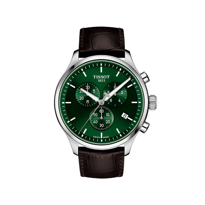 Experience timeless elegance with the Tissot Chrono XL Chronograph Classic Watch for men. Its luxurious brown leather strap perfectly complements the striking green dial, while its chronograph feature allows for precise timekeeping. Expertly crafted by Tissot, this watch is the ultimate combination of style and functionality.