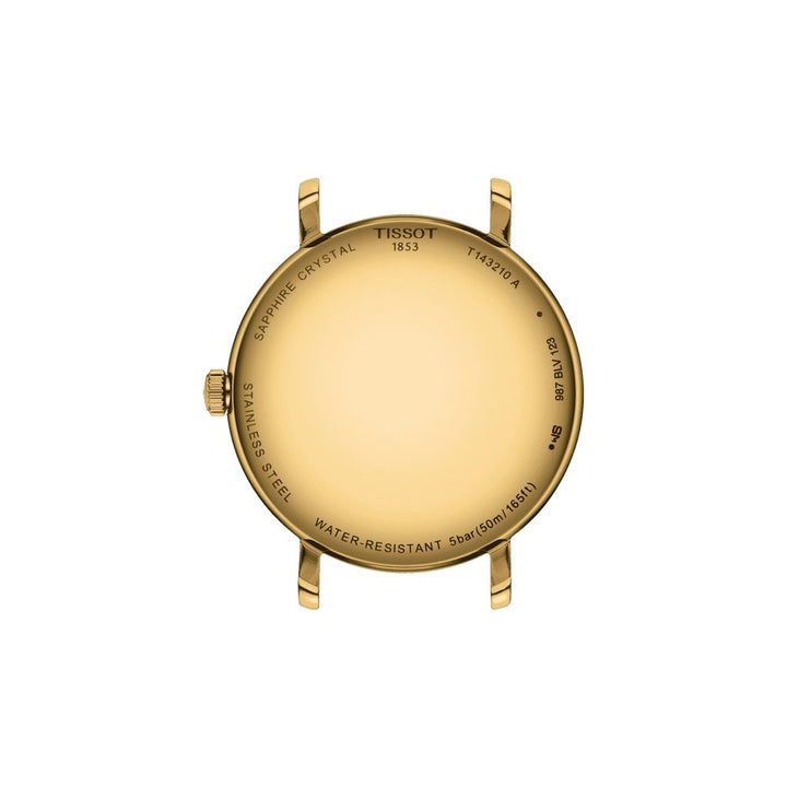 The Tissot Everytime Lady Gold Plated Watch T143.210.33.021.00 watch combines a 34mm round-shaped gold-plated stainless steel case and a gold-plated interchangeable stainless-steel mesh bracelet with a fold-over clasp to fasten. It has a gold-tone sunray analogue dial with gold-plated indexes and hands, which are protected beneath scratch-resistant sapphire crystal glass. Power is generated by the Swiss quartz movement. This model also has a water resistance of up to 50 metres.