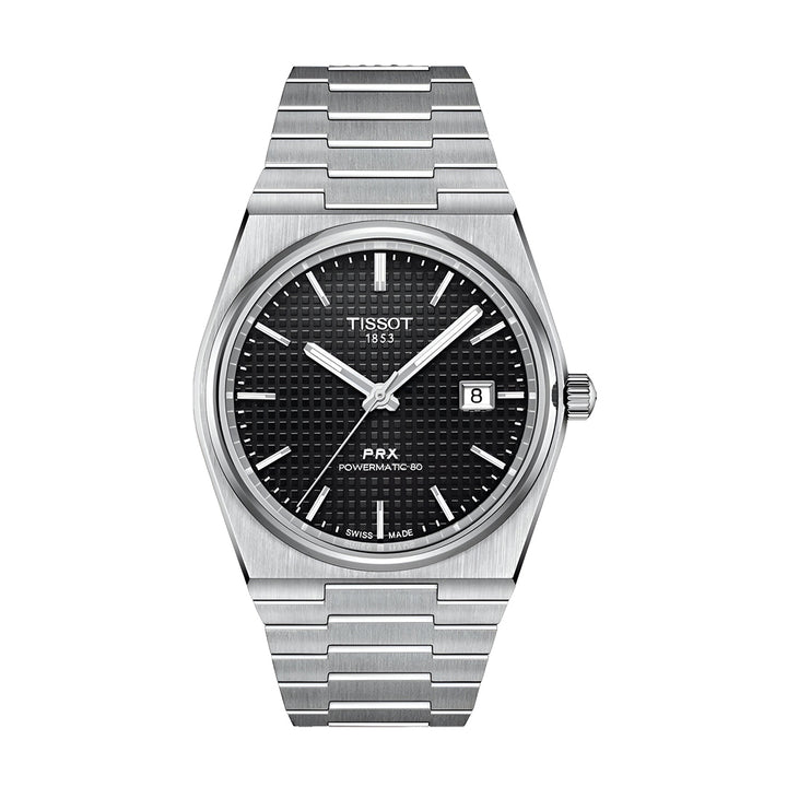 Effortlessly stylish, the Tissot PRX Powermatic 80 watch for men boasts a sleek black dial and silver steel strap. Equipped with Powermatic 80 technology, it offers an impressive 80-hour power reserve for long-lasting precision. Elevate your look with this expertly crafted timepiece.
