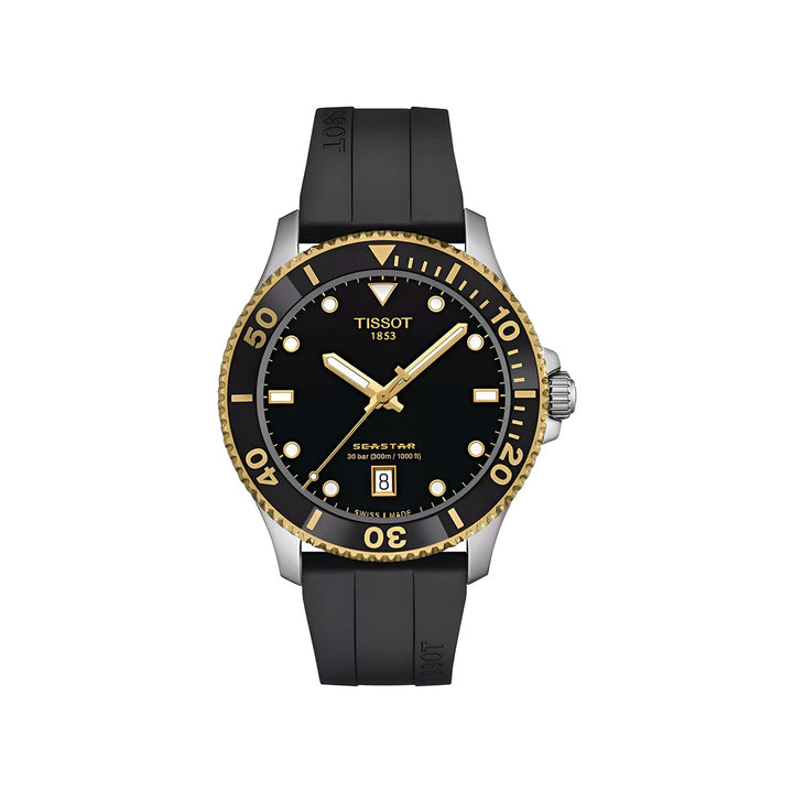 The Seastar 1000 40mm T120.410.27.051.00 is a versatile quartz watch, ideal for both men and women, combining elegance and durability. The gold PVD-coated stainless steel envelope blends perfectly with the black dial, which is further protected by sapphire glass with anti-reflective coating. The F06.412 Swiss Made mechanism ensures precise operation, while the end of battery life (EOL) indicator enhances functionality.