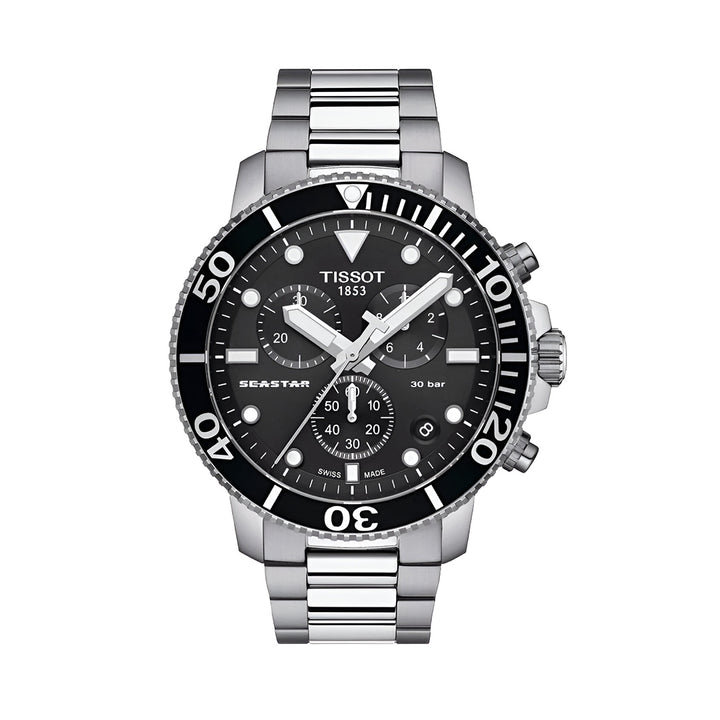 Introducing the Tissot Seastar 1000 Chronograph Watch for men. Featuring a black dial and a silver steel strap, this watch is both stylish and functional. With the ability to withstand depths of up to 1000 feet, this watch is perfect for any water adventurer. Stay on time and on trend with this Tissot timepiece.
