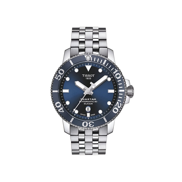 The Tissot Seastar 1000 merges style and performance without compromising either. The diving inspiration shapes both the appearance and the functionality of this watch. It maintains its performance to a pressure of 30 bar (300m/1'000ft), combining underwater sports and a preference for a sophisticated Swiss timepiece. The diving theme continues through elements such as a unidirectional bezel, a strap with a divers' buckle and extension, plus luminescent hands and markings.The automatic choice for real divers. With its high water-resistance up to a pressure of 30 bar (300 m/1000 ft), screw-down crown and caseback as well as its unidirectional ceramic bezel, the Tissot Seastar 1000 Silicium is the ultimate diving watch, now combined with the energy of the Powermatic 80 movement upgraded with a Silicon Balance Spring, making this watch even more appropriate for water sports activities.