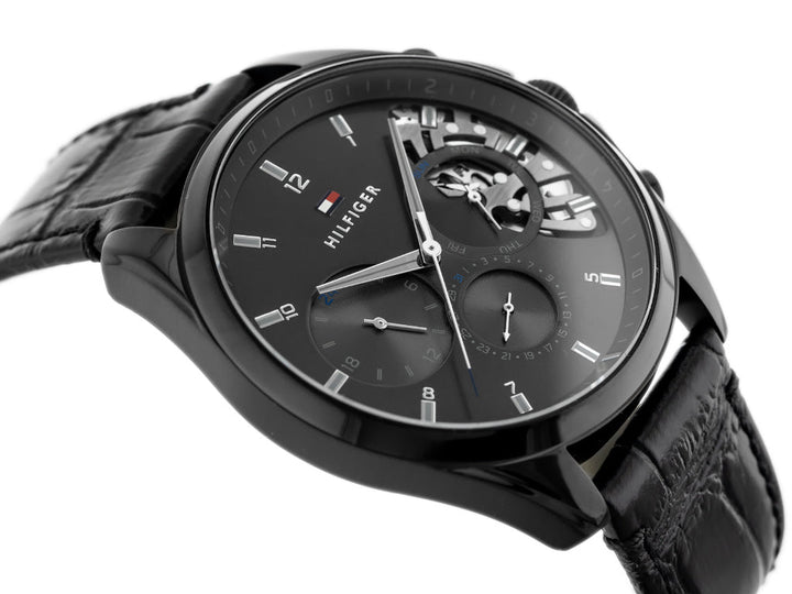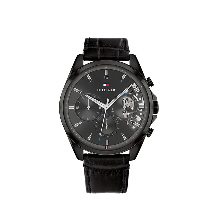 Dress yourself with this smooth all-black Tommy Hilfiger Baker 1710452 Multi Function watch. This timepiece has a striking design, with a bold case size and window allowing you to enjoy the intricate movement underneath. Three subdials offer incredible functionality and classy style. \- Day, Date, and 24-hour subdials