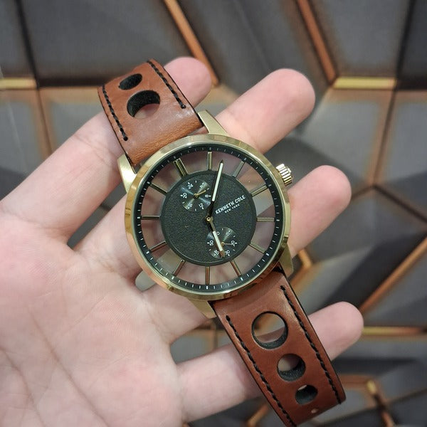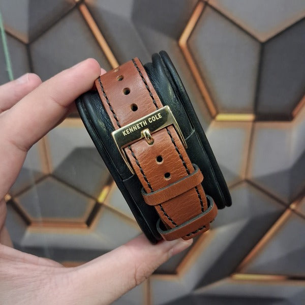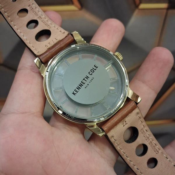 - Kenneth Cole watch with gold-tone stainless steel case and bezel, Brown leather strap with expandable strap