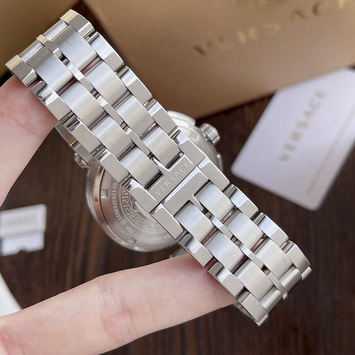 Experience luxury and elegance with the Versace Aion Chronograph Watch for Men. Boasting a sleek black dial and silver steel strap, this watch exudes sophistication. The chronograph feature allows for precise timekeeping while making a stylish statement. Elevate your style with Versace's timeless design and impeccable craftsmanship.